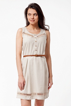 Платье из натуральных волокон льна и хлопка. На полочках и по подолу хлопковая тесьма с мережкой, по горловине и проймам тонкое натуральное кружево. Спереди и сзади на юбке встречные складки, застроченные сверху. Пуговицы - имитация дерева. В комплект платья входит пояс из искусственной кожи. В больших размерах длина ниже колена.