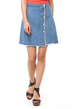 Оригинальная юбка-трапеция выполнена из светлого голубого денима. Модель с ассиметричной застежкой на планку на пуговицах и эффектом необработанного края. Носить такую юбку можно с самой разнообразной одеждой - от легких блузок до футболок.