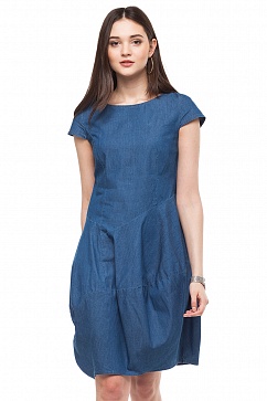 Ассиметричное платье оригинального кроя изготовлено из мягкого денима. Верхняя часть с плотным облеганием по фигуре, нижняя - пышная юбка "баллон". Небольшие втачные рукава, сзади застежка на молнию.