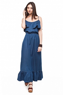 Джинсовое платье-макси на тонких регулирующихся бретельках - безупречный вариант стильного летнего образа. Изделие свободного силуэта, талия собрана на резинку. Низ изделия и горловина декорированы широкими, пышными воланами.