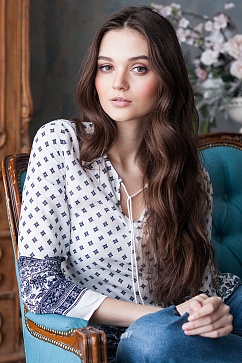 Блуза свободного силуэта с цветочным принтом в этническом стиле. Укороченный рукав 3/4 с расклешением. На груди вырез с завязкой на тонкие тесемки с кисточками. Изделие выполнено из штапельного вискозного полотна.