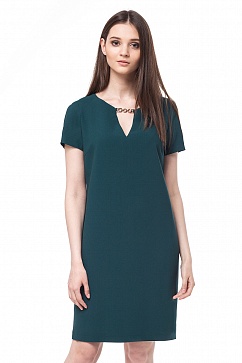 Платье прямого силуэта из мягкого эластичного крепа с зауженной к низу юбкой. Втачной короткий рукав. Спереди V-образный вырез горловины декорирован золотой пряжкой. В больших размерах длина до середины колена.