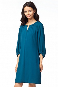 Платье свободного силуэта. Рукава-реглан с фигурным вырезом у манжеты - укороченные спереди. Горловина собрана на сборку, спереди вырез декорирован золотой цепочкой.