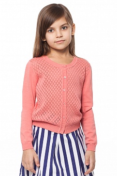 Жакет из мягкой хлопковой пряжи. Перед выполнен ажурной вязкой. Застежка на пуговицы.