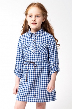 Платье из хлопкового полотна с накладными карманами на груди. Пояс на кулиске из искусственной замши. Спереди застежка на пуговицы контрастного цвета. Манжеты декорированы хлопковым кружевом. Длина рукава регулируется застежкой на пату.