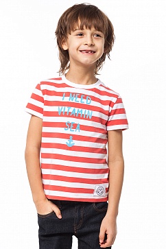 Футболка для мальчика из эластичного хлопкового полотна. Спереди декоративный принт. На рукаве декоративная нашивка с логотипом. По низу изделия нашивка с принтом.