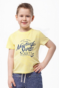 Полосатая футболка для мальчика из трикотажного полотна, спереди принт.