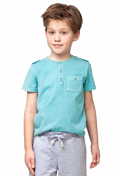 Рубашка для мальчика из хлопкового трикотажа с застежкой-поло на кнопки.Воротник из рибаны в тон основного полотна. Интенсивная стирка придает эффект потертости.