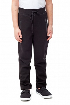 Брюки для мальчика из трикотажа. Пояс выполнен из рибаны с резинкой и завязкой на шнурок. Карманы на молниях.