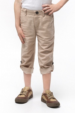 Свободные брюки для мальчика из смешанного (хлопок+лен) полотна. Ложный гульфик. Длина брюк регулируется внутренней патой и пуговицей. Ширина по талии регулируется внутренней резинкой и пуговицей.