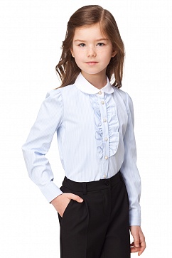 Блузка выполнена из фактурного хлопкового полотна в полоску. Изделие полуприлегающего силуэта, застежка на планку на пуговицах декорирована оборками. Защипы по окату рукава.