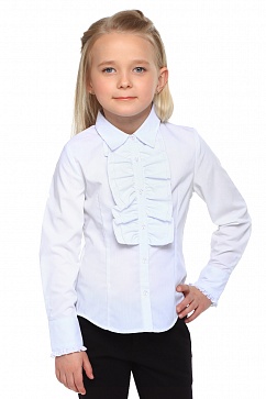 Блузка выполнена из мягкого эластичного хлопкового полотна. Изделие приталенного силуэта, застежка на планку на пуговицах декорирована оборками. Рукава с узкой оборкой по краю манжет.