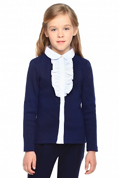 Блузка выполнена из эластичного хлопкового трикотажа "в рубчик". Застежка на планку на пуговицах декорирована оборками. Отложной воротник и оборки дополнены хлопковым кружевом по краю.