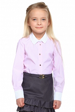 Блузка выполнена из тонкого хлопкового полотна в мелкую полоску. Воротник и манжеты контрастного белого цвета. Изделие приталенного силуэта с застежкой на планку на пуговицах.