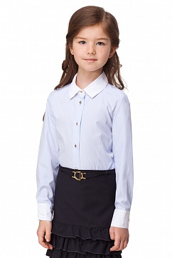 Блузка выполнена из тонкого хлопкового полотна в мелкую полоску. Воротник и манжеты контрастного белого цвета. Изделие приталенного силуэта с застежкой на планку на пуговицах.