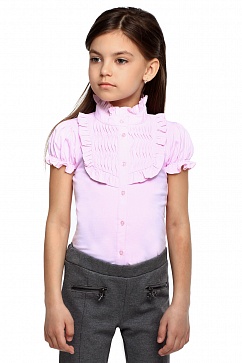 Блузка выполнена из мягкого хлопкового трикотажа, кокетка с декоративными защипами и оборкой по краю - из блузочной ткани. Низ рукавов собран на резинку. Воротник-стойка декорирован оборкой.