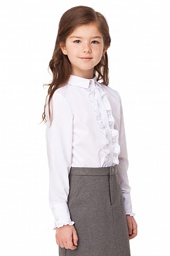 Блузка полуприлегающего силуэта выполнена из мягкого хлопкового полотна. Планка на пуговицах и манжеты декорированы оборками. Отложной воротник, под горловиной декоративная пуговица