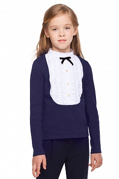 Блузка выполнена из эластичного хлопкового трикотажа "в рубчик". Спереди кокетка из блузочной ткани с рядами декоративных оборок. Воротник стойка, застежка на планку на пуговицах с декоративным бантом под горловиной.