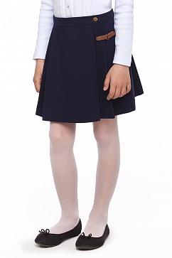 Юбка со складками выполнена из плотного эластичного трикотажа. Застежка на кнопку и пряжку из иск. кожи