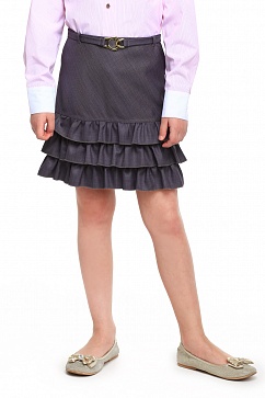 Юбка выполнена из тонкой костюмной ткани с добавлением натурального вискозного волокна, на подкладке. По низу изделия три ряда оборок. Спереди декоративный пояс с металлической пряжкой. Ширина по талии регулируется внутренней резинкой на пуговицах. Сзади застежка на молнию.