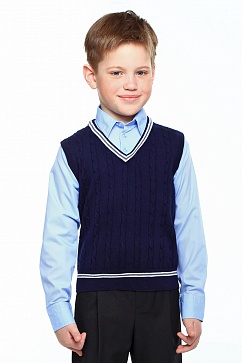 Удобный джемпер-обманка выполнен в виде трикотажной жилетки, одетой на рубашку. Жилет связан из хлопковой пряжи, которая придает особую комфортность при носке. Рукава и воротник выполнены из сорочечной ткани. Такая модель подойдет для школьных будней в хо