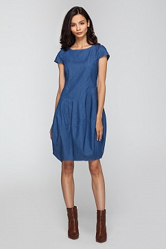 Ассиметричное платье оригинального кроя изготовлено из мягкого денима. Верхняя часть с плотным облеганием по фигуре, нижняя - пышная юбка "баллон". Небольшие втачные рукава, сзади застежка на молнию.
