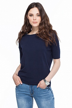 Джемпер свободного силуэта со спущенным плечом связан из эластичной хлопковой пряжи. Укороченный рукав и низ изделия вязан резинкой. На спине декоративный вырез-капля. Низ изделия и рукавов, горловина и плечевой шов вязаны с добавлением в пряжу тонкой люр