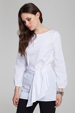 Удлиненная блуза-туника изготовлена из тонкого хлопчатобумажного полотна с добавлением полиэстера для меньшей сминаемости. Широкий длинный пояс завязывается объемным бантом на талии. Укороченный рукав снизу собран на резинку.