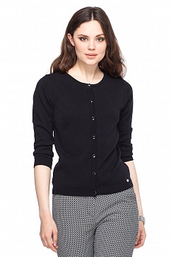 Кардиган из хлопковой пряжи с добавлением нейлона для придания формоустойчивости изделию. Планка с застежкой на эффектными пуговицами с эмалью в тон изделию. Широкая резинка по низу и на манжетах. Рукава 3/4.