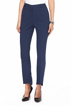 Переосмысление классики с точки зрения современных тенденций. Прямые брюки со стрелкой дополнены ассиметричным низом с укороченной передней частью. Модель выполнена из костюмной ткани с узором, покрой с четырьмя карманами.