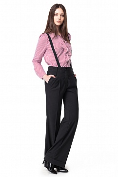 Брюки со стрелками выполнены из эластичной костюмной ткани. Модель имеет актуальный свободный покрой и завышенную талию с притачным поясом. В комплекте лямки, застегивающиеся на потайные пуговицы. По бокам наклонные карманы, сзади ложные карманы в рамку.