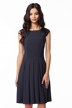Приталенное платье миди из мягкой эластичной костюмной ткани с плотным прилеганием в верхней части и пышной юбкой с глубокими складками. Вырез - лодочка, на плечах декоративные кружевные вставки с фигурным краем. Карманы в боковых швах. Застежка в заднем