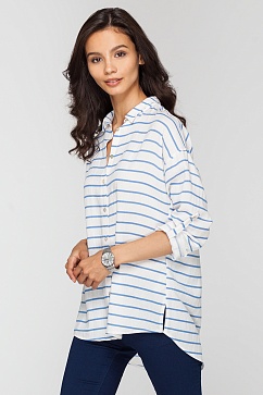 Блузка свободного силуэта со спущенным плечом изготовлена из тонкого вискозного принтованого полотна с небольшим добавлением нейлона для уменьшения сминаемости ткани. Классический отложной воротник, застежка на планку на пуговицах. Накладные карманы. Удли