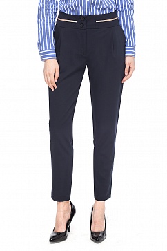 Прямые брюки со стрелкой выполнены из эластичной костюмной ткани. Завышеная линия талии дополнена декоративной лентой контрасного цвета. Модель классической длины с небольшим заужением к низу.