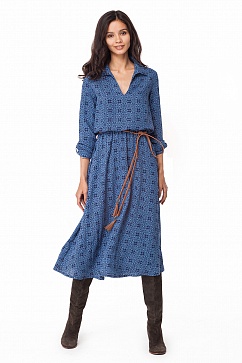 Платье-миди в стиле "бохо" выполнено из плотной вискозной плательной ткани с ярким принтом и легким эффектом жатости. Свободный силуэт с широкой расклешенной юбкой, талия собрана на резинку. Отложной воротник с V-образным вырезом. Длина рукава регулируетс