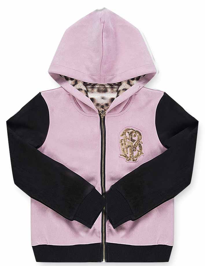 12378-SP Спортивная кофта 65%хлопок 30% полуэстер 5% лайкра Меховой перед и спинка с капюшоном, рукава - кожа, рибана черная, молния - золотая. На груди -вышивка золотом. Подклад атлас леопард. Розовый / Старая цена - 2310,00 руб. / Новая цена, с учетом скидки - 1617 руб. / размер - 140