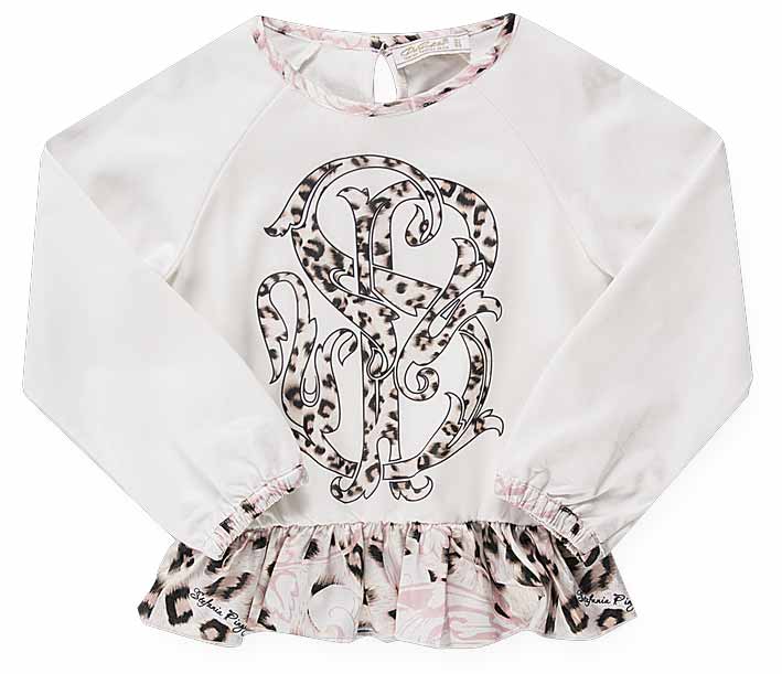 12350-SP Блузка 95%хлопок5%спандекс Блузка шелковая с баской из принтованного шелка, горловина, капелька с пуговицей дали . манжеты - обрботаны принтованным шелком, манжеты на резинке. На полочке принт. На спине логотип стефания принт со стразами прозрачными. Молочный / Старая цена - 1320,00 руб. / Новая цена, с учетом скидки - 924 руб. / размер - 104