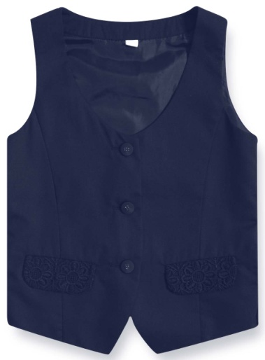 Pinetti School 11784-E Жилет 65%хлопок35%полиэстер Жилетка из костюмной ткани с передними карманами "клапанами", с отрезной объемной баской на спинке. Декорирована кружевом, застежка на три пуговицы. темно-синий / ЦЕНА - 1930,00 руб. / размер - 158