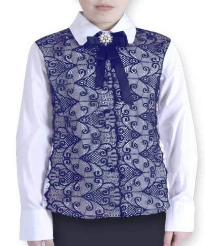 Pinetti School 11945 Блузка длинный рукав 65%хлопок33%полиэстер2%эластан Блузка из хлопка с эластаном с длинными рукавами и отложным воротником. По переду декорирована настрочным контрастным кружевом. белый/синий /цена - 1810,00 руб. / размер - 146
