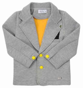 Pinetti I "Ready set Action" 57397-I Пиджак 65%хлопок35%вискоза Пиджак из неопрена,прямого силуэта с отложным воротником и застежкой на две кнопки, с принтом на полочке и спинке. Серый 92-122 2210 / Новая цена, с учетом скидки - 1105 руб. / размер - 110
