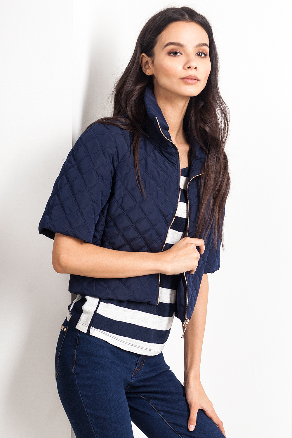 Укороченная куртка из плотной плащевой ткани, выполненной из нитей двух оттенков для придания фактурного матового мерцания. Изделие простёгано с утеплителем двойной строчкой ромбами, на подкладке. Особенностями являются - короткие рукава выше локтя и широ