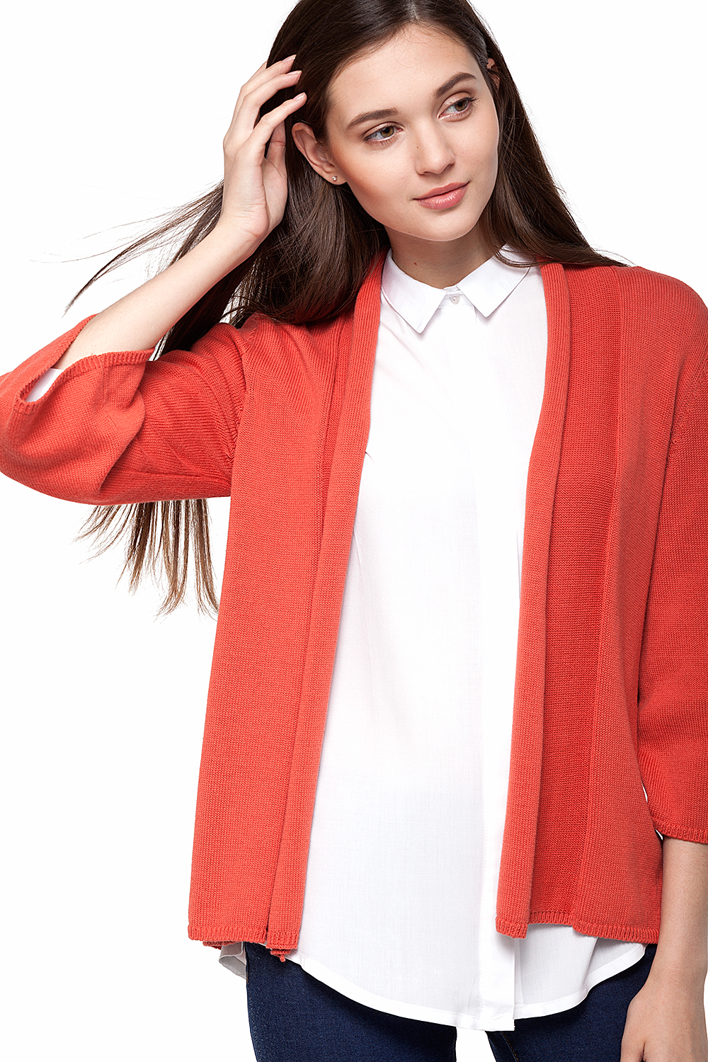 Жакет свободного силуэта из хлопковой пряжи с добавлением акрила, который придает изделию мягкость и пластичность. Рукава 3\4 с расклешением к низу. Спереди отделочная широкая планка, переходящая в отложной воротник.