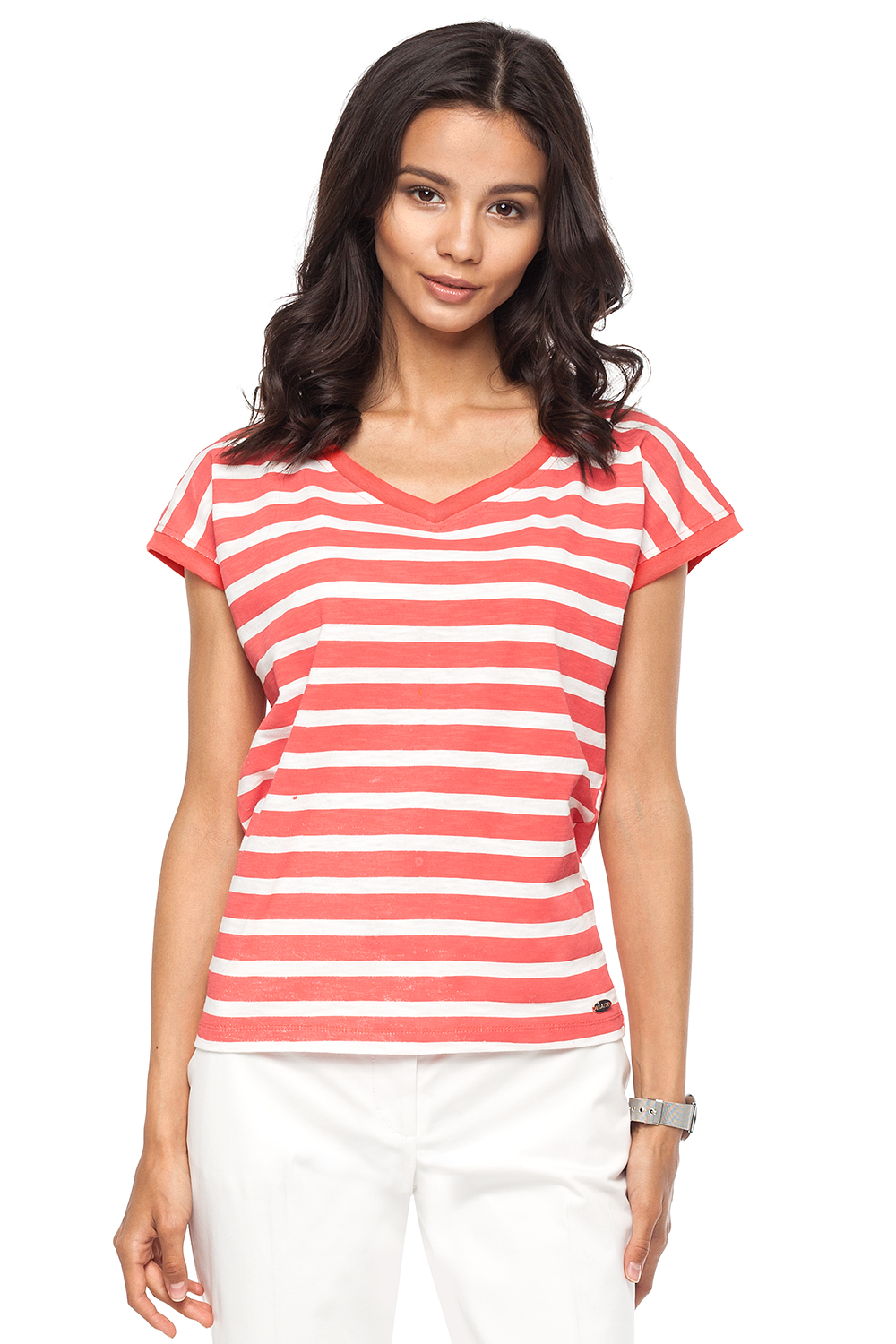 Футболка выполнена из принтованого хлопкового полотна в сине-белую полоску. Окантовка рукавов и горловины из рибаны. Модель свободного фасона с V-образным вырезом идеально подойдет для базового летнего гардероба.