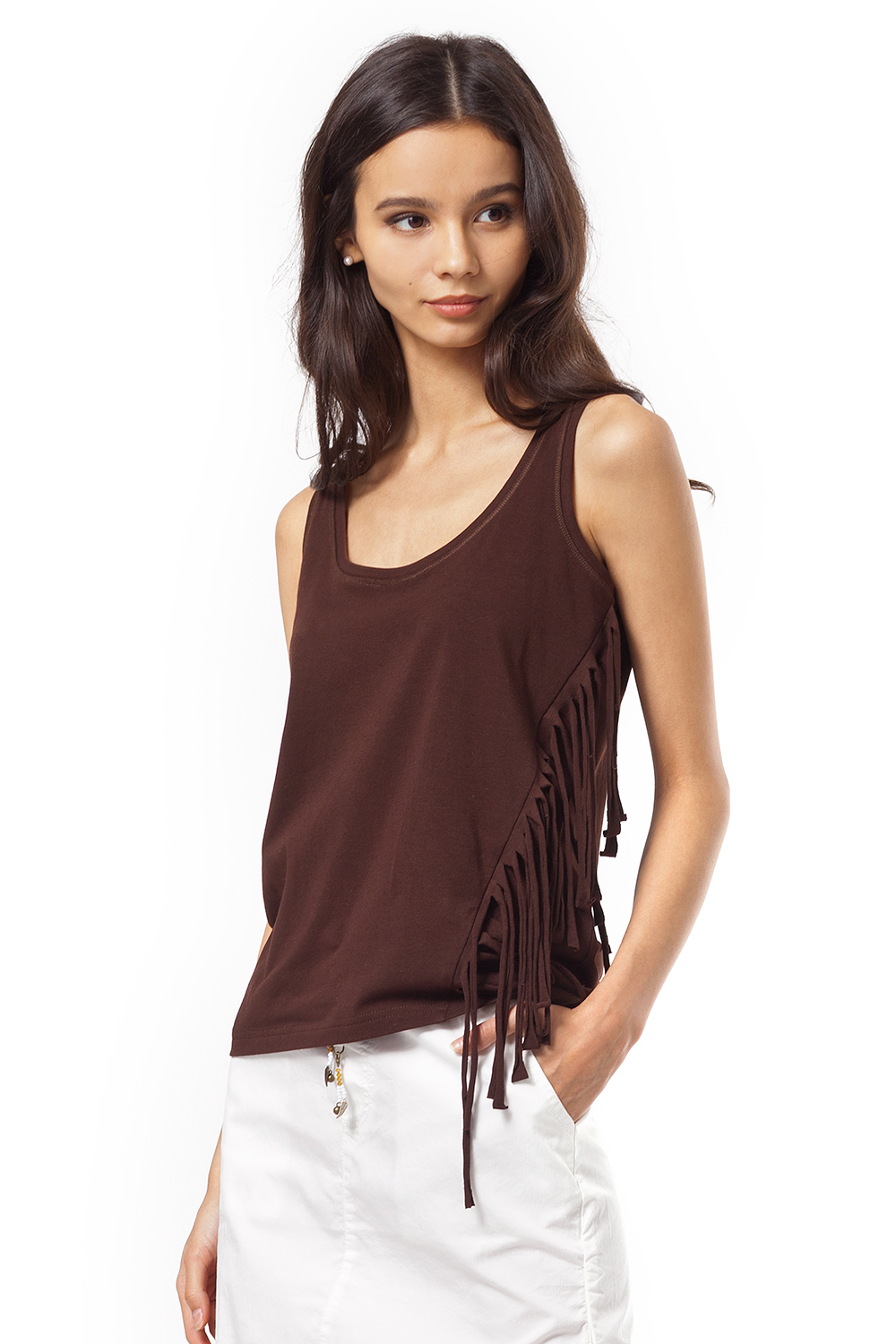 Топ выполнен из мягкого эластичного хлопкового полотна. Горловина и проймы обработаны обтачкой с декоративными отстрочками. Изделие с удлиненной спинкой, доковой рельеф дополнен эффектной декоративной вставкой с длинной бахромой.
