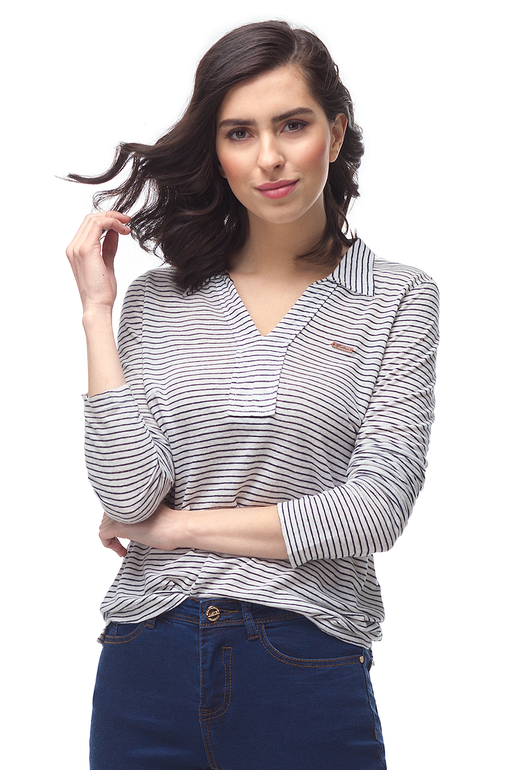 Блузка из натуральных волокон ЛЬНА и вискозы, обеспечивающих комфорт при носке. Классический отложной воротник, v-образный вырез горловины декорирован широкой планкой. Удлиненная спинка, на груди кожаная нашивка с логотипом.