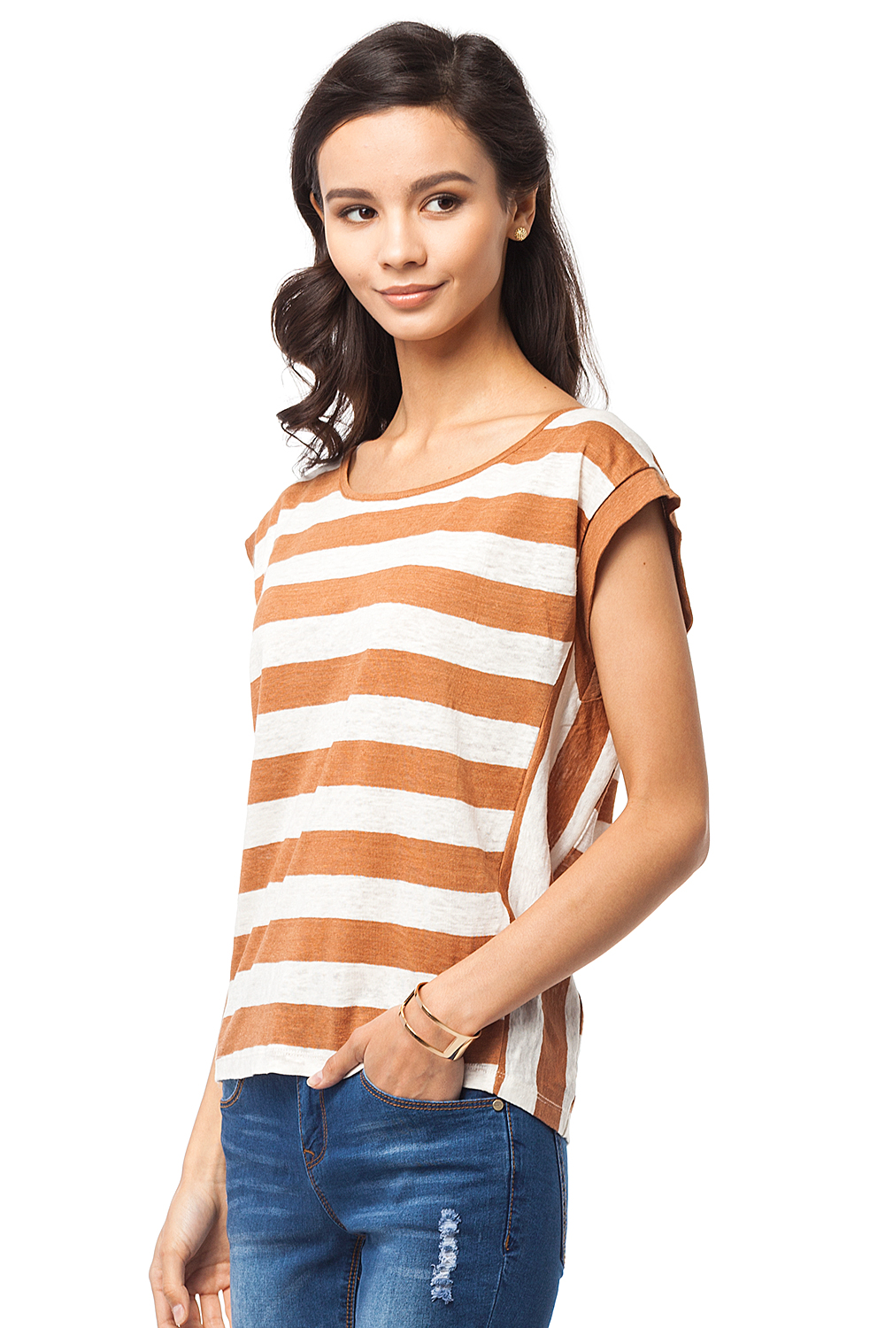 Футболка изготовлена из 100% ЛЬНЯНОГО трикотажного полотна в горизонтальную полоску. Горловина и пройма окантованы однотонным полотном. По бокам изделия декоративные вставки с вертикальным расположением полос, которые подчеркивают силуэт.