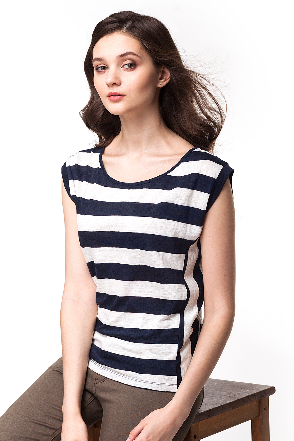 Футболка изготовлена из 100% ЛЬНЯНОГО трикотажного полотна в горизонтальную полоску. Горловина и пройма окантованы однотонным полотном. По бокам изделия декоративные вставки с вертикальным расположением полос, которые подчеркивают силуэт.