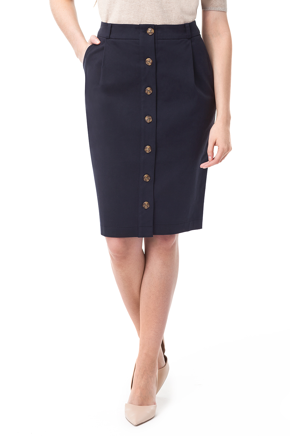 Юбка изготовлена из плотного эластичного хлопка. Силуэт с заужением к низу. Спереди застежка на планку на пуговицах. По бокам наклонные карманы, сзади карманы с листочками