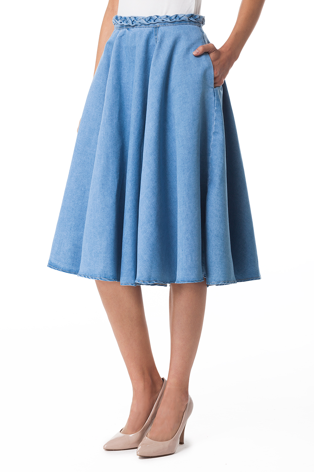Объемная юбка-миди из плотной мягкой джинсы, покрой - солнце. Пояс декорирован сплетенной из джинсовых полосок косичкой. Застежка на металлическую молнию.