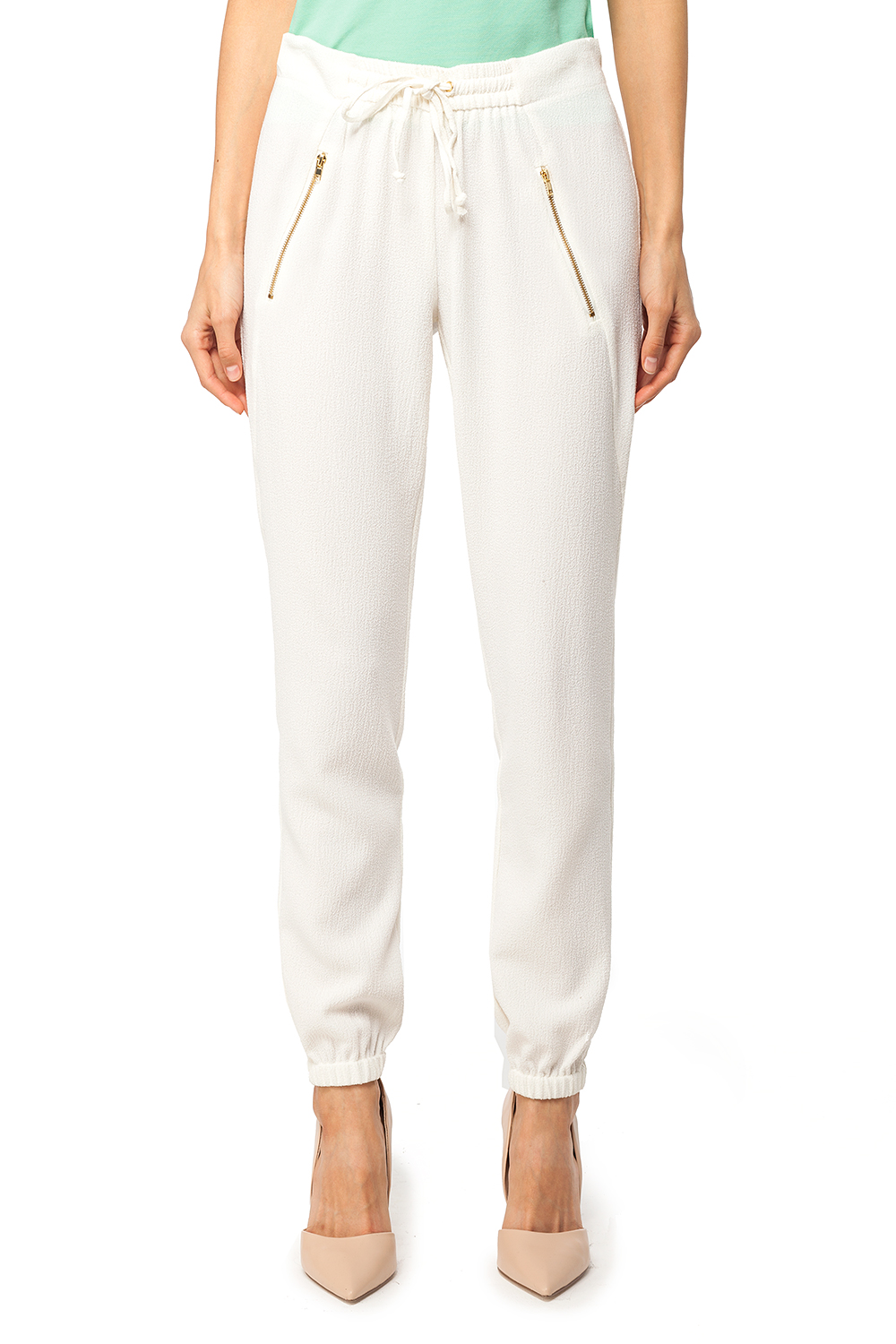 Свободные брюки в спортивном стиле изготовлены из пластичного крепового полотна. Пояс частично собран на резинку и регулируется завязкой на шнурок. Спереди декоративные наклонные швы с молниями золотистого цвета. Низ штанины собраны на резинку.